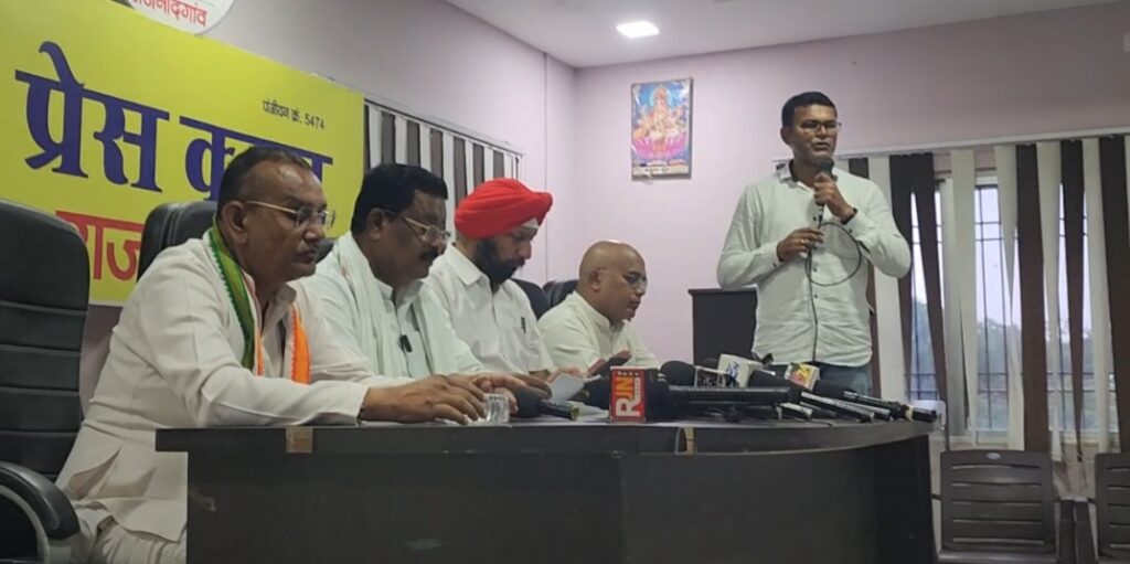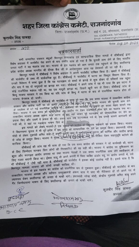 भाजपा के इस षडयंत्र को आम जनता तक पहंुचाने के लिए छत्तीसगढ़ प्रदेश कांग्रेस अध्यक्ष दीपक बैज के आदेशानुसार 05 अक्टूबर रविवार को राजनांदगांव प्रभारी खुज्जी विधायक भोलाराम साहू, शहर कांग्रेस अध्यक्ष कुलबीर सिंह छाबड़ा व जिला ग्रामीण कांग्रेस अध्यक्ष भागवत साहू द्वारा प्रेसवार्ता लेकर जानकारी दी।
