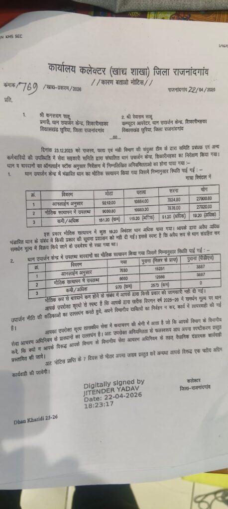 कलेक्टर कार्यालय से कारण बताओ नोटिस जारी किया गया है, वहीं धान खरीदी में 19.20 क्विंटल अतिरिक्त धान मिलने से मामला और संदिग्ध हो गया है।जांच जारी है—आरोप सही पाए जाने पर कड़ी कार्रवाई तय मानी जा रही है।