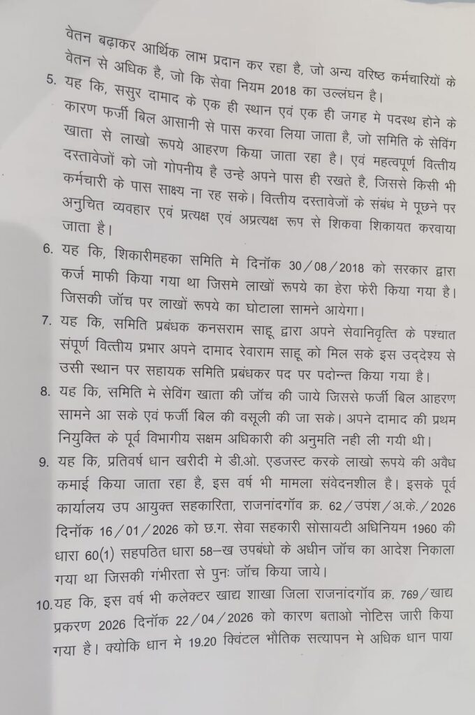 ..राजनांदगांव (छत्तीसगढ़)- छुरिया क्षेत्र के शिकारीमहका सेवा सहकारी समिति में बड़े आर्थिक घोटाले के आरोप सामने आए हैं। समिति के प्रबंधक कन्सराम साहू और उनके दामाद सहायक प्रबंधक रेवारीराम साहू पर नियमों के विरुद्ध कार्य कर लाखों रुपये की अनियमितता करने की शिकायत की गई है।आरोप है कि दोनों वर्षों से एक ही समिति में पदस्थ रहकर नियमों का उल्लंघन कर रहे हैं।